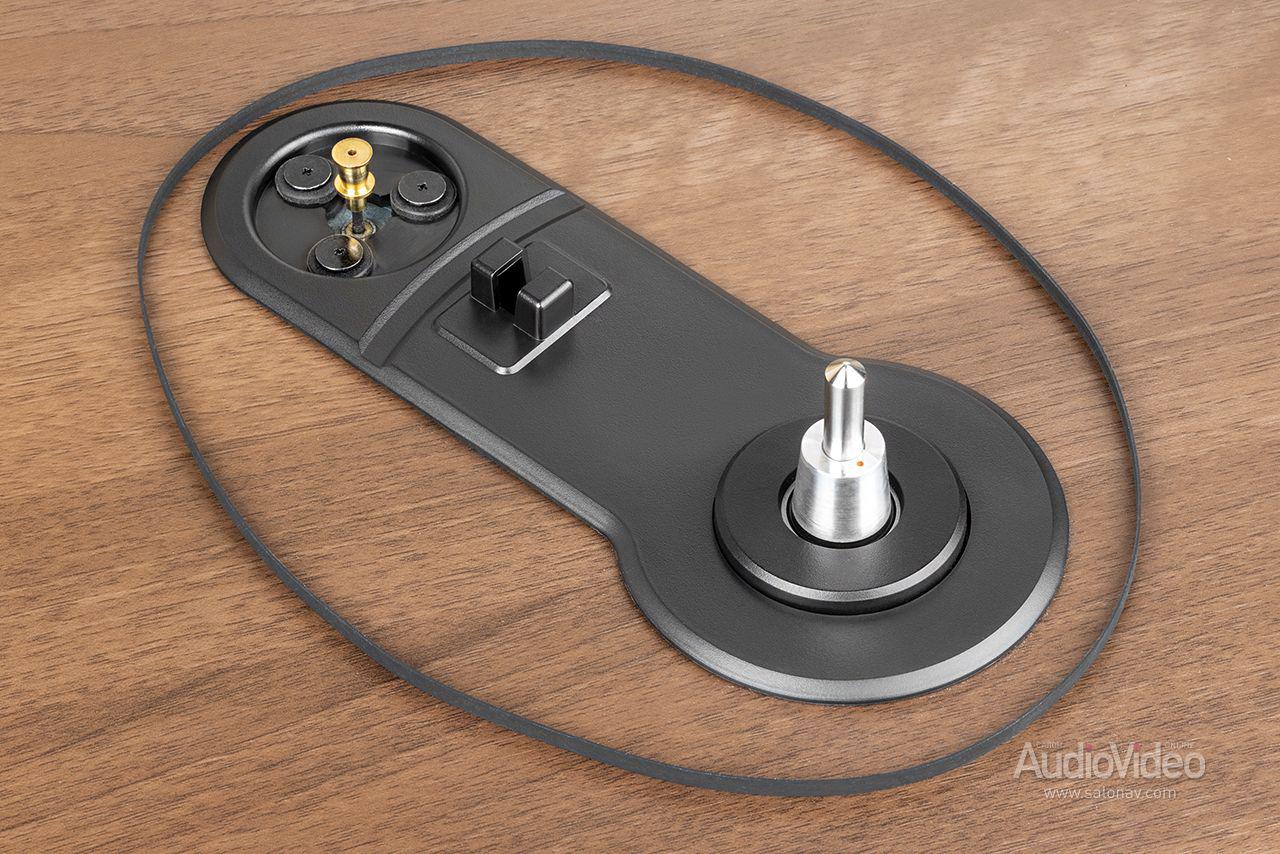 Лёгкий диск, отлитый из алюминиевого сплава, приводится в движение пассиком, надетым не на внешний, как часто делается, а на внутренний обод. При этом, как известно, инерционные свойства маховика используются более полно. Чтобы пассик было удобнее надевать на шкив двигателя, в верхней плоскости сделаны фигурные отверстия. Чтобы не нарушить балансировку, при сборке нужно совместить красные точки на диске и шпинделе, на который он надевается. Штатный мат — резиновый.