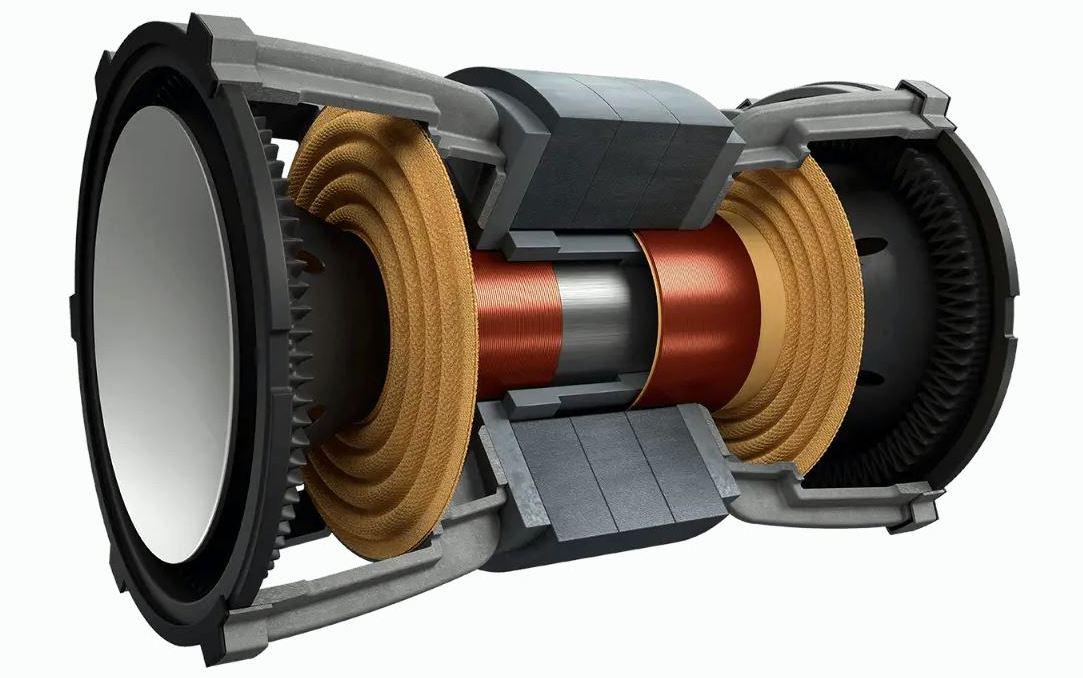 Два расположенных в одной горизонтальной плоскости, но противоположно направленных басовых драйвера имеют общую магнитную систему и оснащаются звуковыми катушками особой конструкции – у них разный диаметр, но общий центр, и, когда они движутся, одна катушка частично заходит внутрь другой. Это, с одной стороны, даёт возможность уменьшить объём корпуса акустической системы, поскольку обе катушки используют для работы одно общее пространство, с другой – увеличить длину хода излучателя, а, значит, и эффективность всей системы.